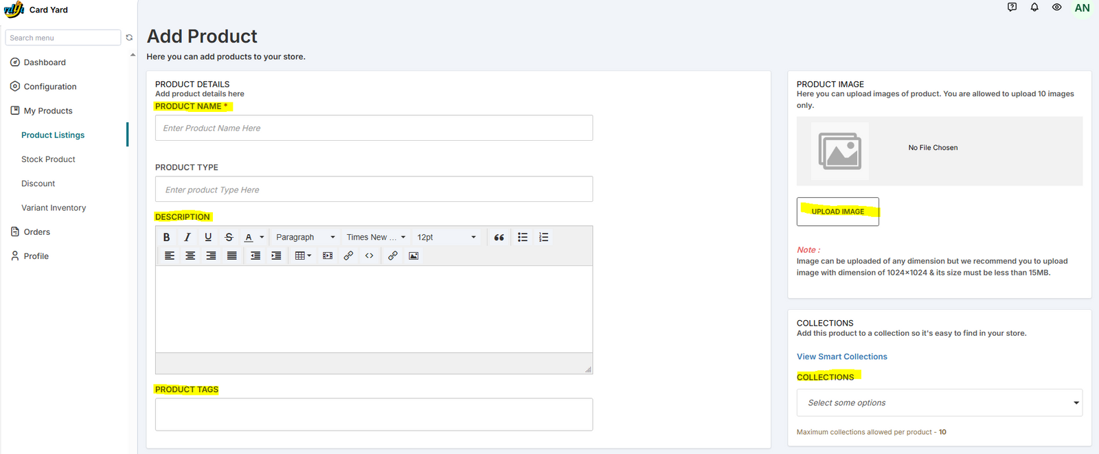 Name, description, image, product tags and collections are on the first half of the info page. Product tags and collections are ways that your product is sorted. Collections are highly recommended so that people can find your card easier, if you can't find a collection you think your item belongs in, let us know and we can add one! Product tags are still a work in progress but will eventually be used for customers to narrow down their search even more. Think of putting "rookie", team name, or anything else that might not be in a collection for your tag. Collections are a broad way to sort, while tags will narrow it down.