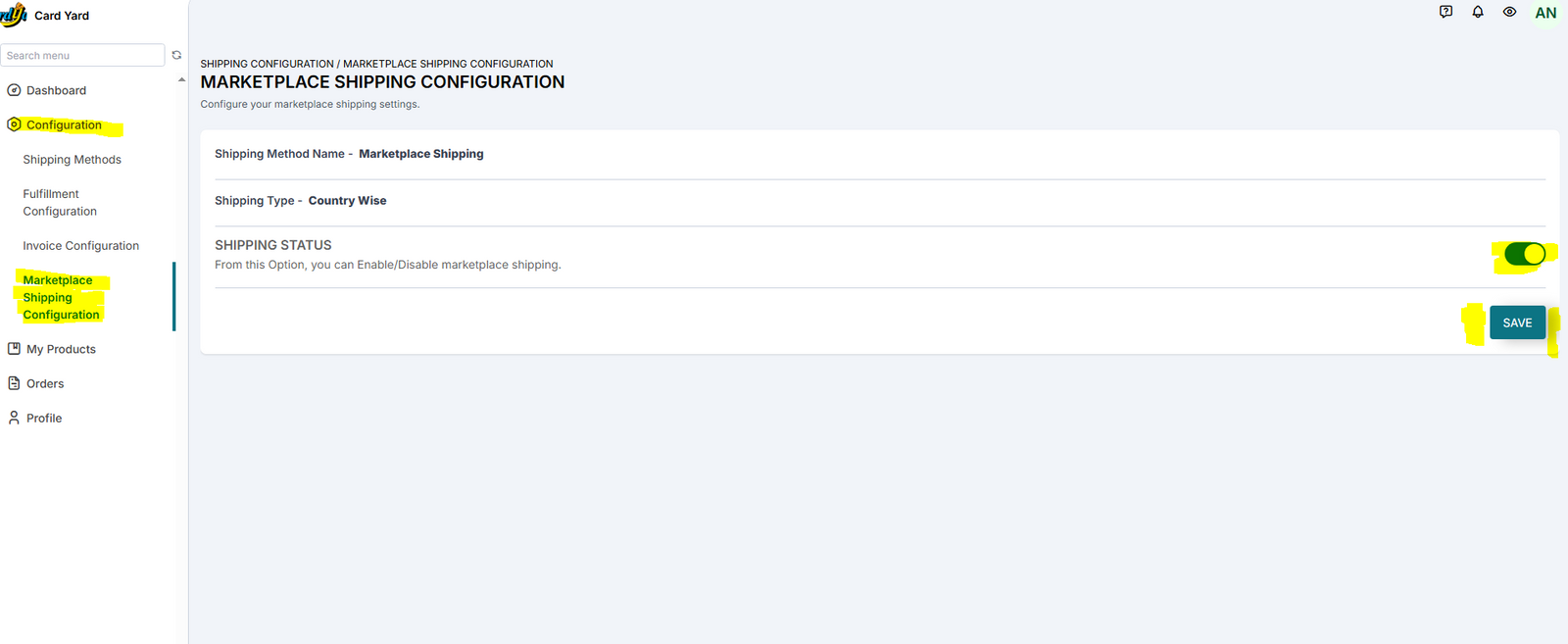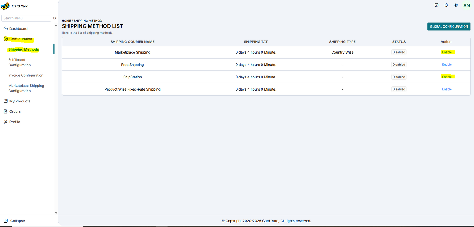 Select configuration. Then select shipping methods. Then press the enable button for marketplace shipping and ShipStation. Ship Station must be enabled, if not you will not be able to ship products.