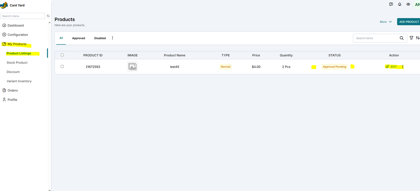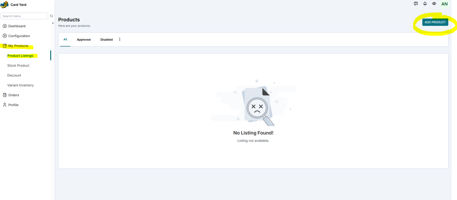 Go to the My Products tab, click product listings and then on the right side press add product.