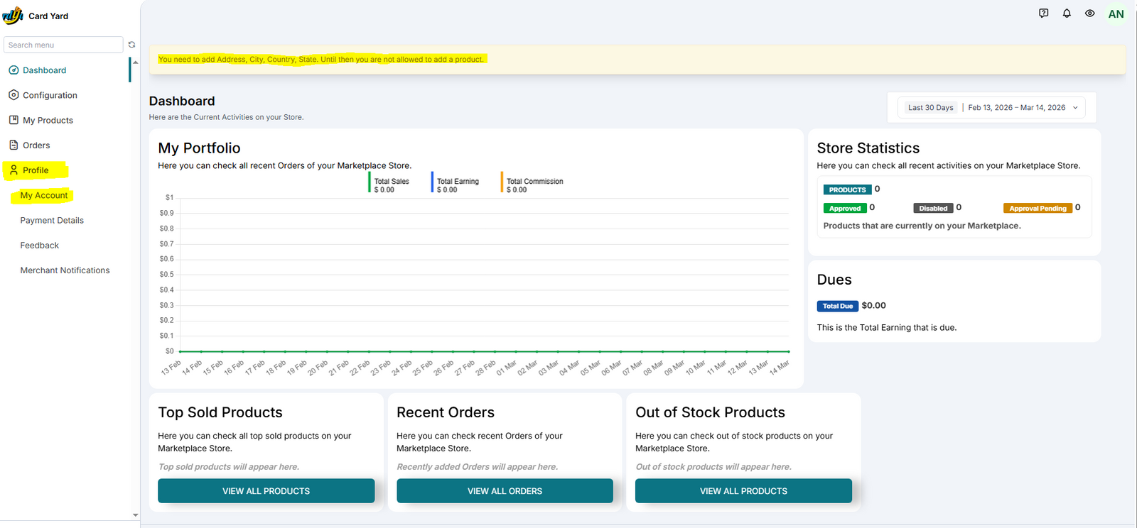 Click on profile, then my account to add your ship from address and any store description/ policy that you want to add.