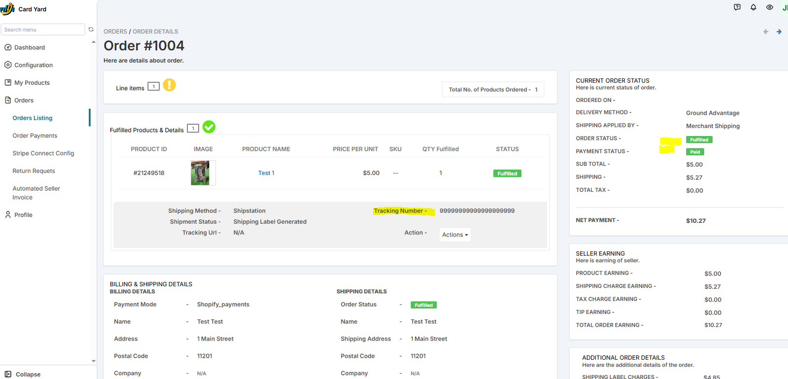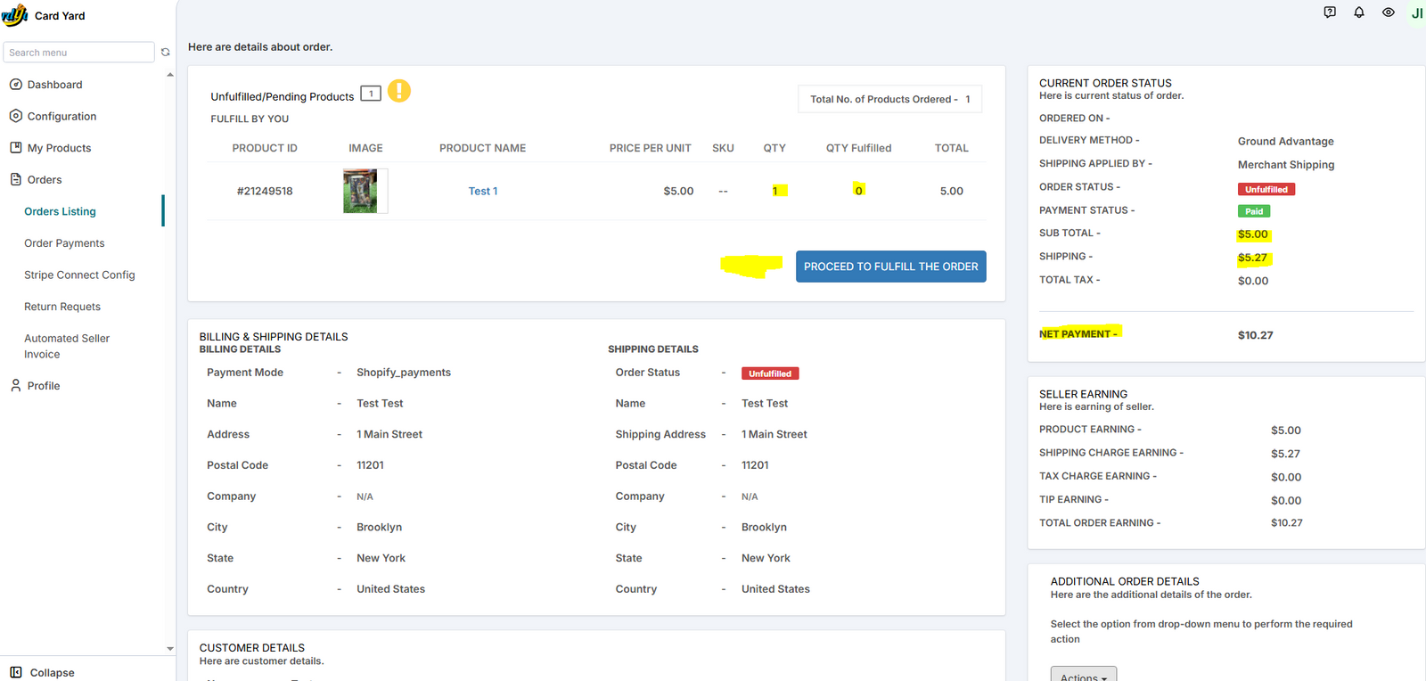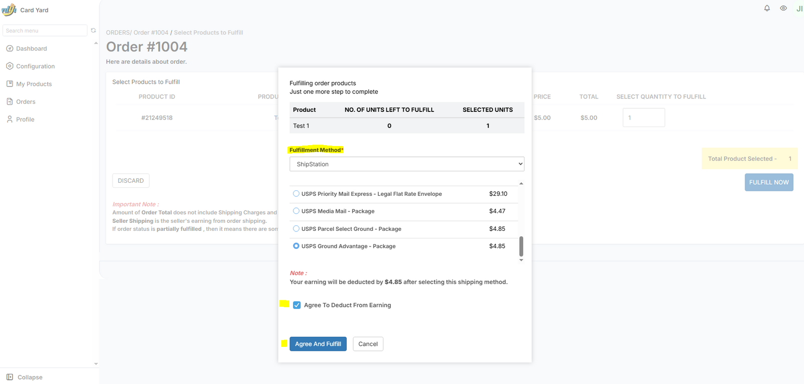 After you press agree and fulfill, a shipping label will appear. Print that and begin to prepare your package for shipment. Once that is complete, this order form will appear and you have successfully fulfilled an order. If anything seems wrong, please reach out to us immediately at info@cardyard.shop so we can help out.