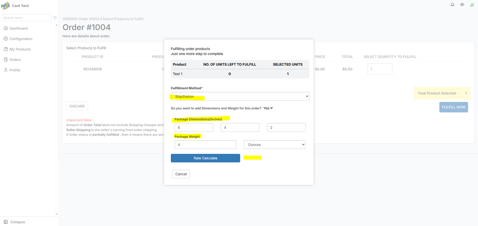 Make sure you choose ShipStation as your shipping method. Then Select "YES" to add package dimensions and weight. Then enter your dimensions and press calculate rate.