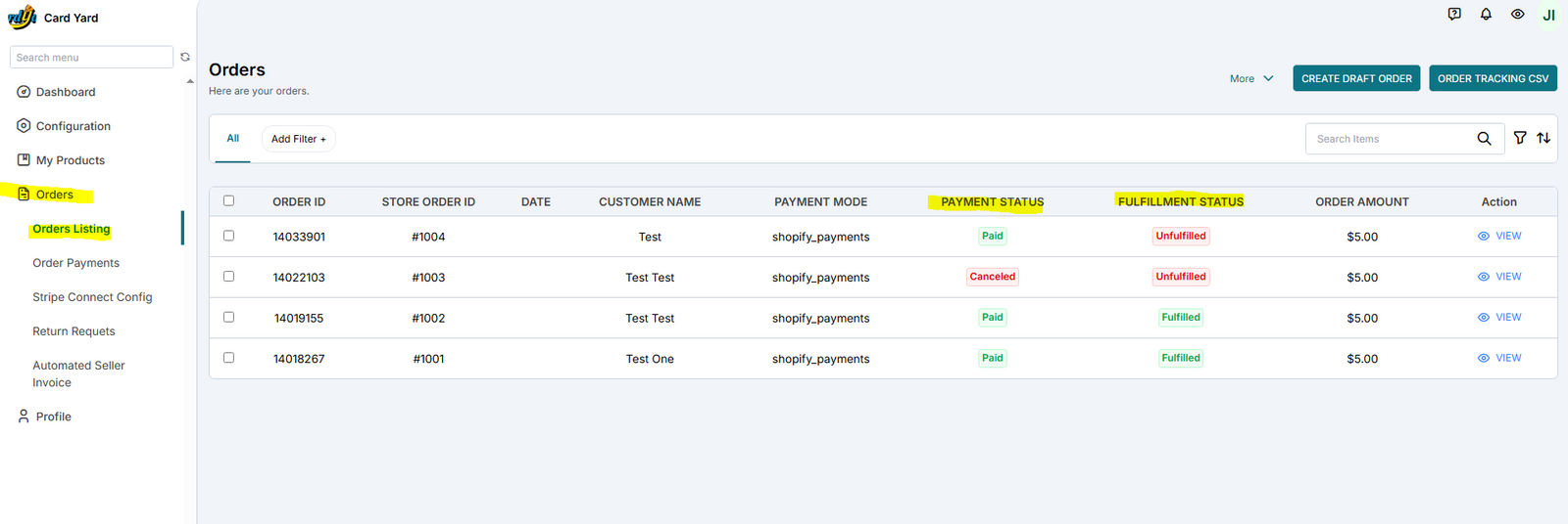 Go to Orders, then Orders Listing so you can see your current orders. Take a look at payment status to ensure it was paid. Then fulfilment status to see what you still need to ship. For all new orders, the status should be "Unfulfilled" so press on view to start the fulfillment process.