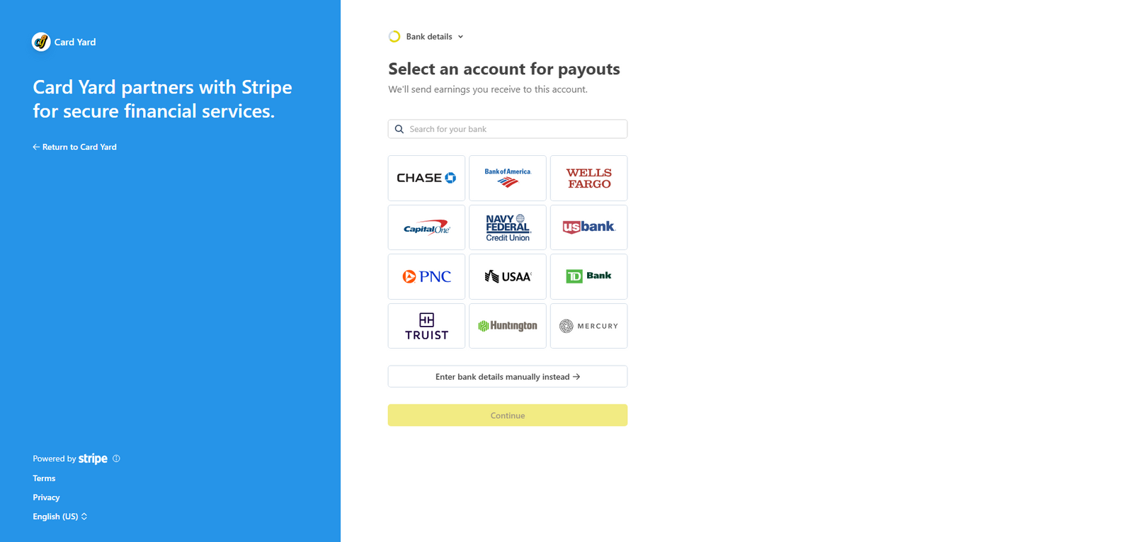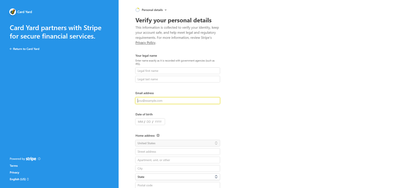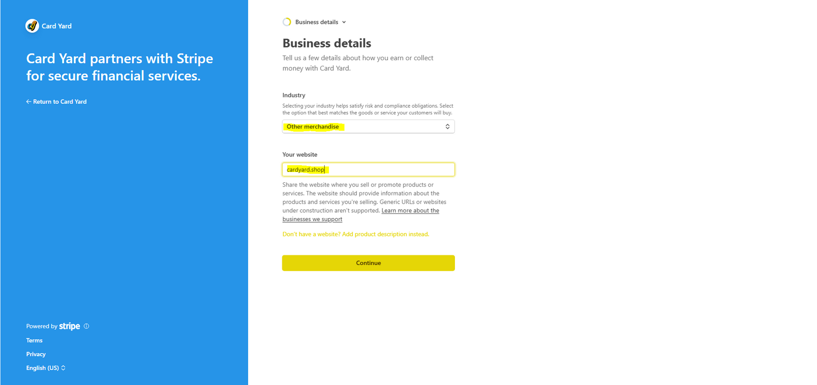 Once you click "add account to stripe" on the seller dashboard you will be taken to Stripe's website and this will begin the secure onboarding. Go through the first few steps of entering your email and phone number. You will then be taken to a tell us about your business page. If you do not have a company, then select individual. If you select individual you will then see this page. For industry put "other merchandise" and then enter cardyard.shop for your website.
