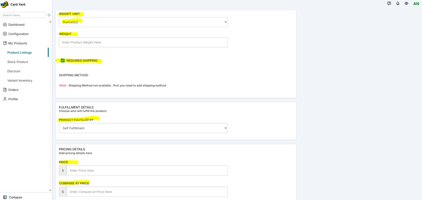 *If your card is over $250 then go to product fulfilled by and select Card Yard Fulfillment, then select AFTER SALE. This will allow for the verification process. *